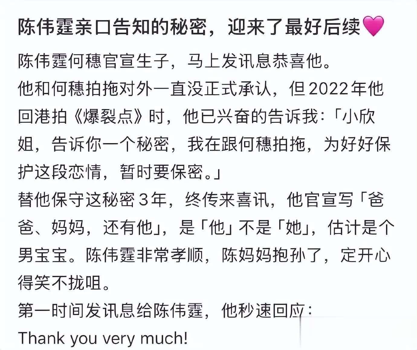 这枚重磅炸弹抛出后,香港资深媒体人查小欣的一篇发文,更是揭开了这场长达数年“地下情”的隐秘一角。她透露,早在2022年陈伟霆回香港拍摄电影《爆裂点》期间,就曾私下兴奋地跟她分享秘密:“告诉你一个秘密,我在跟何穗拍拖,为好好保护这段恋情,暂时要保密。”